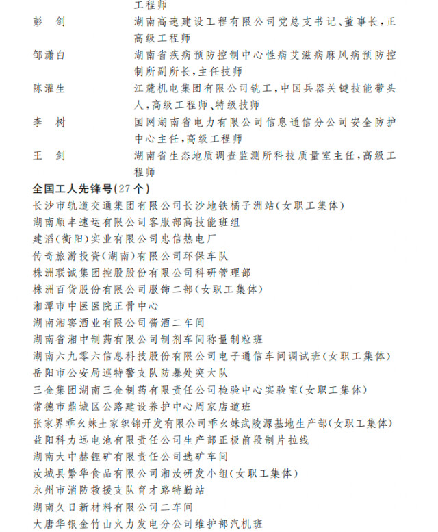 4月28日,中华全国总工会举行全国五一劳动奖表彰大会,表彰全国五一劳动奖3024个,湖南有74个集体和个人光荣上榜。其中,9家单位荣获全国五一劳动奖状,38人荣获全国五一劳动奖章,27个集体荣获全国工人先锋号。