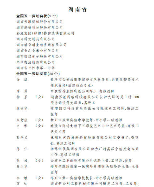 经过层层审核,湖南省有华声在线股份有限公司等9家单位荣获全国五一劳动奖状称号,来自长沙市公安局刑事侦查支队的许斌等38名个人荣获全国五一劳动奖章称号,长沙市轨道交通集团有限公司长沙地铁橘子洲站(女职工集体)等27个集体荣获全国工人先锋号称号。